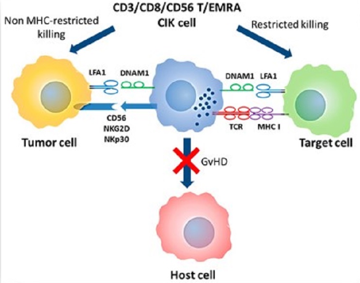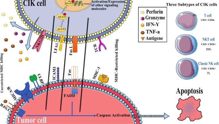 There has been less information about the cytotoxicity of CIK cells and its exact mechanism has not been completely elucidated. Blocking monoclonal antibodies against leukocyte function‐associated antigen‐1 and intercellular adhesion molecule‐1 inhibits the cytotoxic effect of CIK cells. As a result, CIK cells have a cell‐to‐cell contact mediated by tumor cell lysis. [7].
