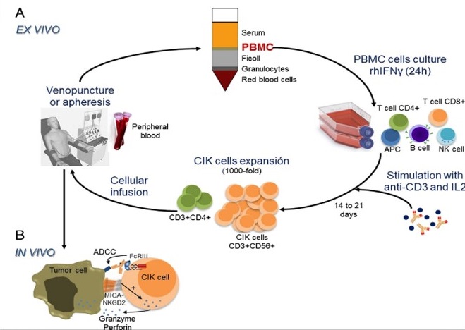 Cytokine-induced killer cells were first discovered in 1991 [1] and are a heterogeneous population of CD8+ T cells, which were generated from human peripheral blood lymphocytes (PBLs) and simply expanded ex vivo via incubation with an anti-CD3 antibody, interferon-γ (IFN-γ), and interleukin (IL)-2. They can kill tumor cells mediated by FasL and perforin [2].